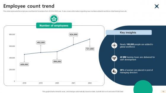 This slide represents the employee count trend of Accenture from 2018 to 2022 year. It also covers information regarding new members added to workforce, total training hours etc.Find highly impressive Employee Count Trend Global Consulting And Technology Services Company Profile CP SS V on Slidegeeks to deliver a meaningful presentation. You can save an ample amount of time using these presentation templates. No need to worry to prepare everything from scratch because Slidegeeks experts have already done a huge research and work for you. You need to download Employee Count Trend Global Consulting And Technology Services Company Profile CP SS V for your upcoming presentation. All the presentation templates are 100 percent editable and you can change the color and personalize the content accordingly. Download now This slide represents the employee count trend of Accenture from 2018 to 2022 year. It also covers information regarding new members added to workforce, total training hours etc.