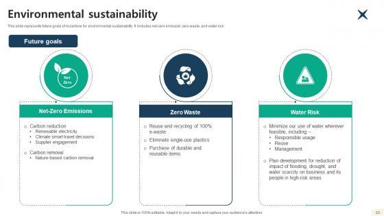 This slide represents future goals of Accenture for environmental sustainability. It includes net-zero emission, zero waste, and water risk. If your project calls for a presentation, then Slidegeeks is your go-to partner because we have professionally designed, easy-to-edit templates that are perfect for any presentation. After downloading, you can easily edit Environmental Sustainability Global Consulting And Technology Services Company Profile CP SS V and make the changes accordingly. You can rearrange slides or fill them with different images. Check out all the handy templates This slide represents future goals of Accenture for environmental sustainability. It includes net-zero emission, zero waste, and water risk.