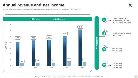 This slide represents on financial highlights of Accenture which represents revenue and net income for last five years from 2018 to 2022.Boost your pitch with our creative Annual Revenue And Net Income Global Consulting And Technology Services Company Profile CP SS V. Deliver an awe-inspiring pitch that will mesmerize everyone. Using these presentation templates you will surely catch everyones attention. You can browse the ppts collection on our website. We have researchers who are experts at creating the right content for the templates. So you do not have to invest time in any additional work. Just grab the template now and use them. This slide represents on financial highlights of Accenture which represents revenue and net income for last five years from 2018 to 2022.