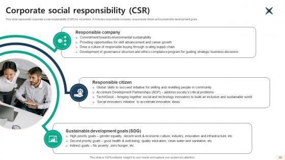 This slide represents corporate social responsibility CSR for Accenture. It includes responsible company, responsible citizen and sustainable development goals.Present like a pro with Corporate Social Responsibility CSR Global Consulting And Technology Services Company Profile CP SS V. Create beautiful presentations together with your team, using our easy-to-use presentation slides. Share your ideas in real-time and make changes on the fly by downloading our templates. So whether you are in the office, on the go, or in a remote location, you can stay in sync with your team and present your ideas with confidence. With Slidegeeks presentation got a whole lot easier. Grab these presentations today. This slide represents corporate social responsibility CSR for Accenture. It includes responsible company, responsible citizen and sustainable development goals.