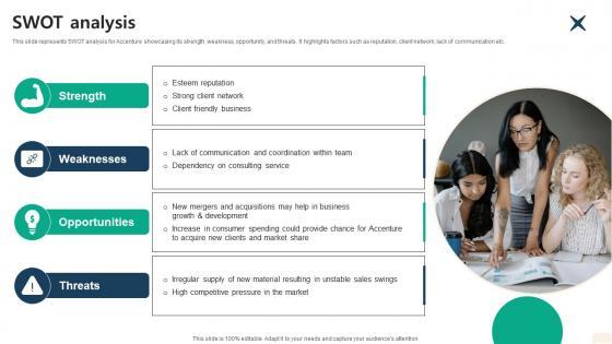 This slide represents SWOT analysis for Accenture showcasing its strength, weakness, opportunity, and threats. It highlights factors such as reputation, client network, lack of communication etc.Are you searching for a SWOT Analysis Global Consulting And Technology Services Company Profile CP SS V that is uncluttered, straightforward, and original Its easy to edit, and you can change the colors to suit your personal or business branding. For a presentation that expresses how much effort you have put in, this template is ideal With all of its features, including tables, diagrams, statistics, and lists, its perfect for a business plan presentation. Make your ideas more appealing with these professional slides. Download SWOT Analysis Global Consulting And Technology Services Company Profile CP SS V from Slidegeeks today. This slide represents SWOT analysis for Accenture showcasing its strength, weakness, opportunity, and threats. It highlights factors such as reputation, client network, lack of communication etc.