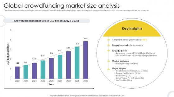 This slide shows information regarding the past and forecasted market size of crowdfunding industry. It also includes key insights related to largest market, compound annual growth rate, key players etc. Formulating a presentation can take up a lot of effort and time, so the content and message should always be the primary focus. The visuals of the PowerPoint can enhance the presenters message, so our Global Crowdfunding Market Size Analysis Crowdfunding For Nonprofits To Support Fin SS V was created to help save time. Instead of worrying about the design, the presenter can concentrate on the message while our designers work on creating the ideal templates for whatever situation is needed. Slidegeeks has experts for everything from amazing designs to valuable content, we have put everything into Global Crowdfunding Market Size Analysis Crowdfunding For Nonprofits To Support Fin SS V This slide shows information regarding the past and forecasted market size of crowdfunding industry. It also includes key insights related to largest market, compound annual growth rate, key players etc.