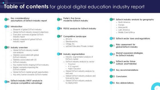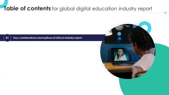 Do you have to make sure that everyone on your team knows about any specific topic I yes, then you should give Table Of Contents For Global Digital Education Industry Report IR SS V a try. Our experts have put a lot of knowledge and effort into creating this impeccable Table Of Contents For Global Digital Education Industry Report IR SS V. You can use this template for your upcoming presentations, as the slides are perfect to represent even the tiniest detail. You can download these templates from the Slidegeeks website and these are easy to edit. So grab these today Our Table Of Contents For Global Digital Education Industry Report IR SS V are topically designed to provide an attractive backdrop to any subject. Use them to look like a presentation pro.