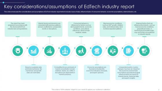 This slide showcases the considerations and assumptions of EdTech industry report which includes basis of data, influence factor of consumer behavior, economic assumptions, external factors, etc. The best PPT templates are a great way to save time, energy, and resources. Slidegeeks have 100 percent editable powerpoint slides making them incredibly versatile. With these quality presentation templates, you can create a captivating and memorable presentation by combining visually appealing slides and effectively communicating your message. Download Global Digital Education Key Considerations Assumptions Of Edtech Industry Report IR SS V from Slidegeeks and deliver a wonderful presentation. This slide showcases the considerations and assumptions of EdTech industry report which includes basis of data, influence factor of consumer behavior, economic assumptions, external factors, etc.