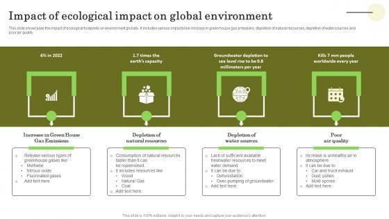 This slide showcases the impact of ecological footprints on environment globally. It includes various impacts like increase in green house gas emissions, depletion of natural resources, depletion of water sources and poor air quality. Pitch your topic with ease and precision using this Impact Of Ecological Impact On Global Environment Graphics Pdf This layout presents information on House Gas Emissions, Natural Resources, Poor Air Quality It is also available for immediate download and adjustment. So, changes can be made in the color, design, graphics or any other component to create a unique layout. This slide showcases the impact of ecological footprints on environment globally. It includes various impacts like increase in green house gas emissions, depletion of natural resources, depletion of water sources and poor air quality.