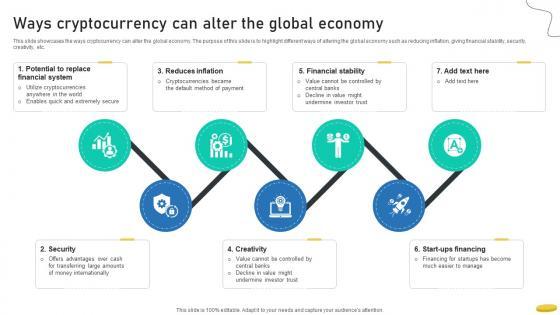 This slide showcases the ways cryptocurrency can alter the global economy. The purpose of this slide is to highlight different ways of altering the global economy such as reducing inflation, giving financial stability, security, creativity, etc.Welcome to our selection of the Ways Cryptocurrency Can Alter The Global Economy Cryptocurrency Management With Blockchain. These are designed to help you showcase your creativity and bring your sphere to life. Planning and Innovation are essential for any business that is just starting out. This collection contains the designs that you need for your everyday presentations. All of our PowerPoints are 100 percent editable, so you can customize them to suit your needs. This multi-purpose template can be used in various situations. Grab these presentation templates today. This slide showcases the ways cryptocurrency can alter the global economy. The purpose of this slide is to highlight different ways of altering the global economy such as reducing inflation, giving financial stability, security, creativity, etc.