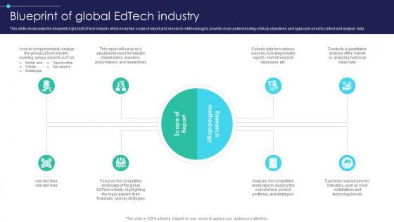 This slide showcases the blueprint of global EdTech industry which includes scope of report and research methodology to provide clear understanding of study objectives and approach used to collect and analyze data. Boost your pitch with our creative Global Digital Education Blueprint Of Global Edtech Industry IR SS V. Deliver an awe-inspiring pitch that will mesmerize everyone. Using these presentation templates you will surely catch everyones attention. You can browse the ppts collection on our website. We have researchers who are experts at creating the right content for the templates. So you do not have to invest time in any additional work. Just grab the template now and use them. This slide showcases the blueprint of global EdTech industry which includes scope of report and research methodology to provide clear understanding of study objectives and approach used to collect and analyze data.