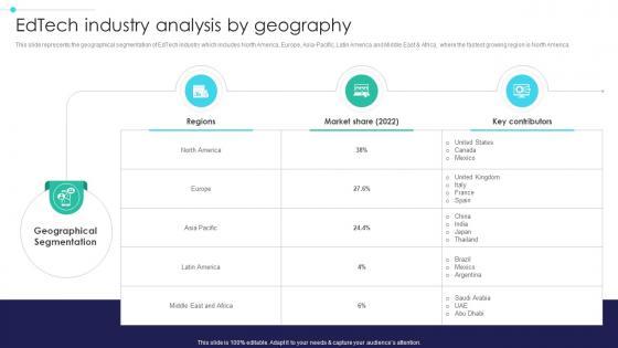 This slide represents the geographical segmentation of EdTech industry which includes North America, Europe, Asia-Pacific, Latin America and Middle East and Africa, where the fastest growing region is North America. From laying roadmaps to briefing everything in detail, our templates are perfect for you. You can set the stage with your presentation slides. All you have to do is download these easy-to-edit and customizable templates. Global Digital Education Edtech Industry Analysis By Geography IR SS V will help you deliver an outstanding performance that everyone would remember and praise you for. Do download this presentation today. This slide represents the geographical segmentation of EdTech industry which includes North America, Europe, Asia-Pacific, Latin America and Middle East and Africa, where the fastest growing region is North America.