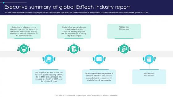 This slide showcases the executive summary of global EdTech industry report to provide a comprehensive overview of entire report. It includes parameters such as industry overview, growth factors, etc. Whether you have daily or monthly meetings, a brilliant presentation is necessary. Global Digital Education Executive Summary Of Global Edtech Industry Report IR SS V can be your best option for delivering a presentation. Represent everything in detail using Global Digital Education Executive Summary Of Global Edtech Industry Report IR SS V and make yourself stand out in meetings. The template is versatile and follows a structure that will cater to your requirements. All the templates prepared by Slidegeeks are easy to download and edit. Our research experts have taken care of the corporate themes as well. So, give it a try and see the results. This slide showcases the executive summary of global EdTech industry report to provide a comprehensive overview of entire report. It includes parameters such as industry overview, growth factors, etc.