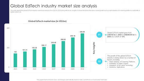 This slide depicts the global EdTech industry market size analysis from 2023 to 2030 along with its key insights. It shows the factors that drive market growth such as rapid adoption of e-learning platforms, availability of digital content, etc. Are you in need of a template that can accommodate all of your creative concepts This one is crafted professionally and can be altered to fit any style. Use it with Google Slides or PowerPoint. Include striking photographs, symbols, depictions, and other visuals. Fill, move around, or remove text boxes as desired. Test out color palettes and font mixtures. Edit and save your work, or work with colleagues. Download Global Digital Education Global Edtech Industry Market Size Analysis IR SS V and observe how to make your presentation outstanding. Give an impeccable presentation to your group and make your presentation unforgettable. This slide depicts the global EdTech industry market size analysis from 2023 to 2030 along with its key insights. It shows the factors that drive market growth such as rapid adoption of e-learning platforms, availability of digital content, etc.