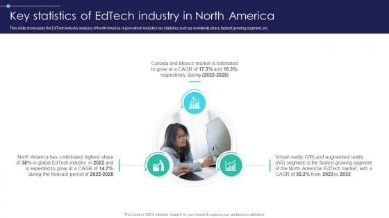 This slide showcases the EdTech industry analysis of North America region which includes key statistics such as worldwide share, fastest growing segment, etc. Here you can discover an assortment of the finest PowerPoint and Google Slides templates. With these templates, you can create presentations for a variety of purposes while simultaneously providing your audience with an eye-catching visual experience. Download Global Digital Education Key Statistics Of Edtech Industry In North America IR SS V to deliver an impeccable presentation. These templates will make your job of preparing presentations much quicker, yet still, maintain a high level of quality. Slidegeeks has experienced researchers who prepare these templates and write high-quality content for you. Later on, you can personalize the content by editing the Global Digital Education Key Statistics Of Edtech Industry In North America IR SS V. This slide showcases the EdTech industry analysis of North America region which includes key statistics such as worldwide share, fastest growing segment, etc.