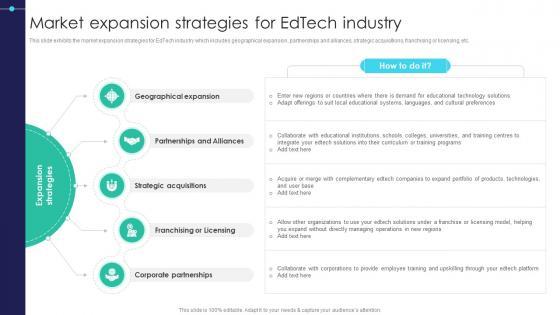 This slide exhibits the market expansion strategies for EdTech industry which includes geographical expansion, partnerships and alliances, strategic acquisitions, franchising or licensing, etc. Take your projects to the next level with our ultimate collection of Global Digital Education Market Expansion Strategies For Edtech Industry IR SS V. Slidegeeks has designed a range of layouts that are perfect for representing task or activity duration, keeping track of all your deadlines at a glance. Tailor these designs to your exact needs and give them a truly corporate look with your own brand colors they will make your projects stand out from the rest This slide exhibits the market expansion strategies for EdTech industry which includes geographical expansion, partnerships and alliances, strategic acquisitions, franchising or licensing, etc.