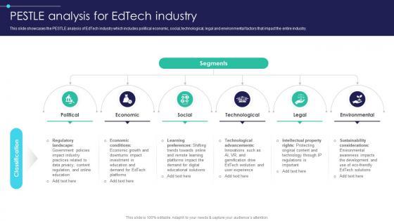 This slide showcases the PESTLE analysis of EdTech industry which includes political economic, social, technological, legal and environmental factors that impact the entire industry. Find a pre-designed and impeccable Global Digital Education Pestle Analysis For Edtech Industry IR SS V. The templates can ace your presentation without additional effort. You can download these easy-to-edit presentation templates to make your presentation stand out from others. So, what are you waiting for Download the template from Slidegeeks today and give a unique touch to your presentation. This slide showcases the PESTLE analysis of EdTech industry which includes political economic, social, technological, legal and environmental factors that impact the entire industry.