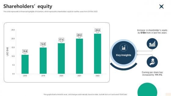 This slide represents on financial highlights of Accenture, which represents shareholders equity for last five years from 2018 to 2022.The Shareholders Equity Global Consulting And Technology Services Company Profile CP SS V is a compilation of the most recent design trends as a series of slides. It is suitable for any subject or industry presentation, containing attractive visuals and photo spots for businesses to clearly express their messages. This template contains a variety of slides for the user to input data, such as structures to contrast two elements, bullet points, and slides for written information. Slidegeeks is prepared to create an impression. This slide represents on financial highlights of Accenture, which represents shareholders equity for last five years from 2018 to 2022.