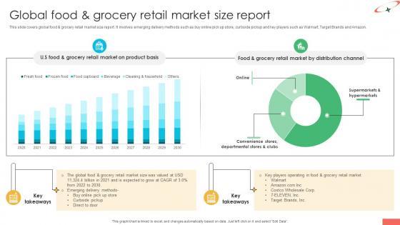 This slide covers global food and grocery retail market size report. It involves emerging delivery methods such as buy online pick up store, curbside pickup and key players such as Walmart, Target Brands and Amazon. If you are looking for a format to display your unique thoughts, then the professionally designed Global Food And Grocery Retail Market Size Report Ppt PowerPoint is the one for you. You can use it as a Google Slides template or a PowerPoint template. Incorporate impressive visuals, symbols, images, and other charts. Modify or reorganize the text boxes as you desire. Experiment with shade schemes and font pairings. Alter, share or cooperate with other people on your work. Download Global Food And Grocery Retail Market Size Report Ppt PowerPoint and find out how to give a successful presentation. Present a perfect display to your team and make your presentation unforgettable. This slide covers global food and grocery retail market size report. It involves emerging delivery methods such as buy online pick up store, curbside pickup and key players such as Walmart, Target Brands and Amazon.