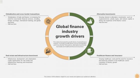 This slide showcases the growth drivers of global finance industry. It includes growth drivers such as Globalization and Cross-Border Transactions, alternative investments, real estate and healthcare finance and insurance. Whether you have daily or monthly meetings, a brilliant presentation is necessary. Global Finance Industry Growth Drivers Strategy For Launching A Financial Strategy SS V can be your best option for delivering a presentation. Represent everything in detail using Global Finance Industry Growth Drivers Strategy For Launching A Financial Strategy SS V and make yourself stand out in meetings. The template is versatile and follows a structure that will cater to your requirements. All the templates prepared by Slidegeeks are easy to download and edit. Our research experts have taken care of the corporate themes as well. So, give it a try and see the results. This slide showcases the growth drivers of global finance industry. It includes growth drivers such as Globalization and Cross-Border Transactions, alternative investments, real estate and healthcare finance and insurance.