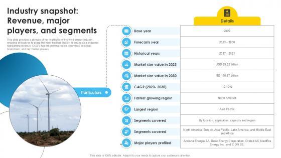 This slide provides a glimpse of key highlights of the wind energy industry, enabling executives to grasp the main findings quickly. It serves as a snapshot highlighting revenue, CAGR, fastest growing region, segments, regional breakdown, and key market players. Coming up with a presentation necessitates that the majority of the effort goes into the content and the message you intend to convey. The visuals of a PowerPoint presentation can only be effective if it supplements and supports the story that is being told. Keeping this in mind our experts created Industry Snapshot Revenue Major Global Wind Power Market PPT Presentation IR SS V to reduce the time that goes into designing the presentation. This way, you can concentrate on the message while our designers take care of providing you with the right template for the situation. This slide provides a glimpse of key highlights of the wind energy industry, enabling executives to grasp the main findings quickly. It serves as a snapshot highlighting revenue, CAGR, fastest growing region, segments, regional breakdown, and key market players.