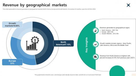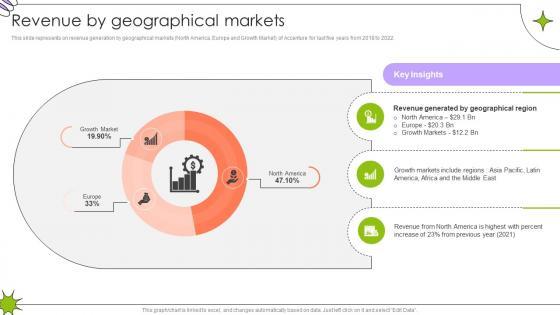 This slide represents on revenue generation by geographical markets North America, Europe and Growth Market of Accenture for last five years from 2018 to 2022.The best PPT templates are a great way to save time, energy, and resources. Slidegeeks have 100 percent editable powerpoint slides making them incredibly versatile. With these quality presentation templates, you can create a captivating and memorable presentation by combining visually appealing slides and effectively communicating your message. Download Revenue By Geographical Markets Global Consulting And Technology Services Company Profile CP SS V from Slidegeeks and deliver a wonderful presentation. This slide represents on revenue generation by geographical markets North America, Europe and Growth Market of Accenture for last five years from 2018 to 2022.
