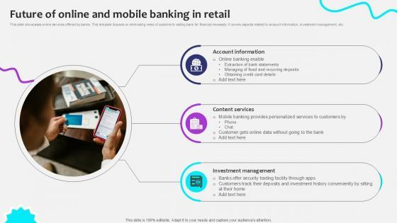 This slide showcases online services offered by banks. This template focuses on eliminating need of customers visiting bank for financial necessity. It covers aspects related to account information, investment management, etc. Whether you have daily or monthly meetings, a brilliant presentation is necessary. Future Of Online And Mobile Initiating Globalization Of Banking Ppt Example can be your best option for delivering a presentation. Represent everything in detail using Future Of Online And Mobile Initiating Globalization Of Banking Ppt Example and make yourself stand out in meetings. The template is versatile and follows a structure that will cater to your requirements. All the templates prepared by Slidegeeks are easy to download and edit. Our research experts have taken care of the corporate themes as well. So, give it a try and see the results. This slide showcases online services offered by banks. This template focuses on eliminating need of customers visiting bank for financial necessity. It covers aspects related to account information, investment management, etc.