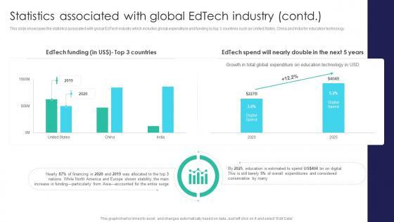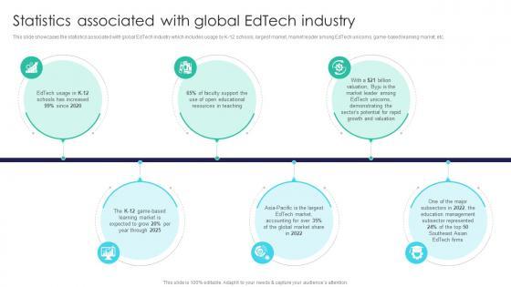 This slide showcases the statistics associated with global EdTech industry which includes usage by K-12 schools, largest market, market leader among EdTech unicorns, game-based learning market, etc. Slidegeeks is one of the best resources for PowerPoint templates. You can download easily and regulate Global Digital Education Statistics Associated With Global Edtech Industry IR SS V for your personal presentations from our wonderful collection. A few clicks is all it takes to discover and get the most relevant and appropriate templates. Use our Templates to add a unique zing and appeal to your presentation and meetings. All the slides are easy to edit and you can use them even for advertisement purposes. This slide showcases the statistics associated with global EdTech industry which includes usage by K-12 schools, largest market, market leader among EdTech unicorns, game-based learning market, etc.
