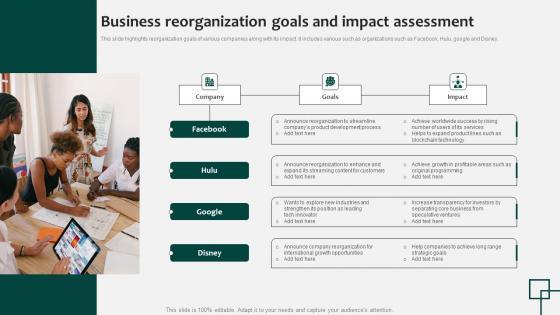 This slide highlights reorganization goals of various companies along with its impact. It includes various such as organizations such as Facebook, Hulu, google and Disney. Pitch your topic with ease and precision using this Business Reorganization Goals And Impact Assessment Information Pdf This layout presents information on Company, Goals, Development Process It is also available for immediate download and adjustment. So, changes can be made in the color, design, graphics or any other component to create a unique layout. This slide highlights reorganization goals of various companies along with its impact. It includes various such as organizations such as Facebook, Hulu, google and Disney.