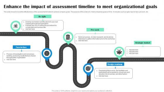 This slide shows to boost the effectiveness of the assessment timeline to achieve company goals. The purpose of this slide is to meet companies goals on time . It includes such as agile, face-to-face, pre work, etc. Showcasing this set of slides titled Enhance The Impact Of Assessment Timeline To Meet Organizational Goals Infographics Pdf The topics addressed in these templates are Strategic Toolset, Design Roadmap, Pre Work All the content presented in this PPT design is completely editable. Download it and make adjustments in color, background, font etc. as per your unique business setting. This slide shows to boost the effectiveness of the assessment timeline to achieve company goals. The purpose of this slide is to meet companies goals on time . It includes such as agile, face-to-face, pre work, etc.