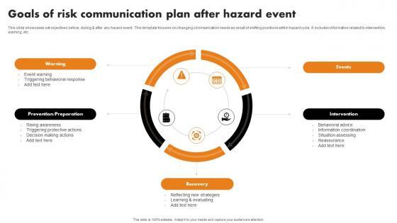 This slide showcases set objectives before, during after any hazard event. This template focuses on changing communication needs as result of shifting positions within hazard cycle. It includes information related to intervention, warning, etc.Pitch your topic with ease and precision using this Goals Of Risk Communication Plan After Hazard Event Sample Pdf This layout presents information on Information Coordination, Situation Assessing, Triggering Behavioral It is also available for immediate download and adjustment. So, changes can be made in the color, design, graphics or any other component to create a unique layout. This slide showcases set objectives before, during after any hazard event. This template focuses on changing communication needs as result of shifting positions within hazard cycle. It includes information related to intervention, warning, etc.