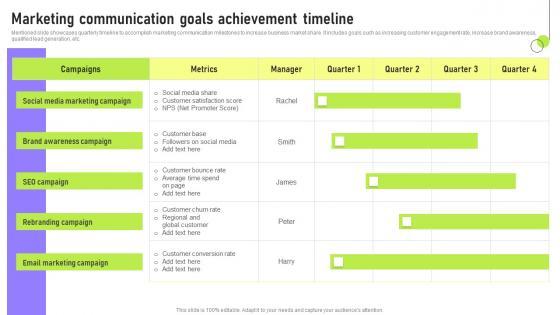 Mentioned slide showcases quarterly timeline to accomplish marketing communication milestones to increase business market share. It includes goals such as increasing customer engagement rate, increase brand awareness, qualified lead generation, etc. Welcome to our selection of the Marketing Communication Goals Deployment Of Marketing Communication Themes Pdf. These are designed to help you showcase your creativity and bring your sphere to life. Planning and Innovation are essential for any business that is just starting out. This collection contains the designs that you need for your everyday presentations. All of our PowerPoints are 100 percent editable, so you can customize them to suit your needs. This multi purpose template can be used in various situations. Grab these presentation templates today. Mentioned slide showcases quarterly timeline to accomplish marketing communication milestones to increase business market share. It includes goals such as increasing customer engagement rate, increase brand awareness, qualified lead generation, etc.