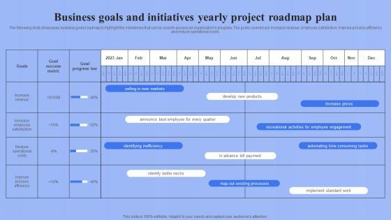 The following slide showcases business goals roadmap to highlight the milestones that can be used to assess an organizations progress. The goals covered are increase revenue, employee satisfaction, improve process efficiency and reduce operational costs. Pitch your topic with ease and precision using this Business Goals And Initiatives Yearly Project Roadmap Plan Ppt Slides Infographics pdf. This layout presents information on Employee Satisfaction, Improve Process, Efficiency And Reduce. It is also available for immediate download and adjustment. So, changes can be made in the color, design, graphics or any other component to create a unique layout. The following slide showcases business goals roadmap to highlight the milestones that can be used to assess an organizations progress. The goals covered are increase revenue, employee satisfaction, improve process efficiency and reduce operational costs.