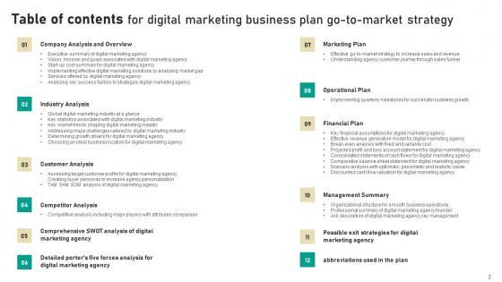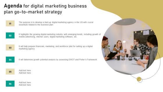 Boost your pitch with our creative Agenda For Digital Marketing Business Plan Go To Market Strategy Graphics Pdf. Deliver an awe-inspiring pitch that will mesmerize everyone. Using these presentation templates you will surely catch everyones attention. You can browse the ppts collection on our website. We have researchers who are experts at creating the right content for the templates. So you do not have to invest time in any additional work. Just grab the template now and use them. Our Agenda For Digital Marketing Business Plan Go To Market Strategy Graphics Pdf are topically designed to provide an attractive backdrop to any subject. Use them to look like a presentation pro.