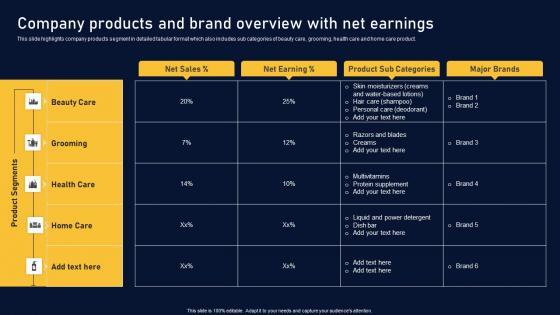 This slide highlights company products segment in detailed tabular format which also includes sub categories of beauty care, grooming, health care and home care product. Find highly impressive Customer Goods Production Company Products And Brand Overview With Net Earnings Rules PDF on Slidegeeks to deliver a meaningful presentation. You can save an ample amount of time using these presentation templates. No need to worry to prepare everything from scratch because Slidegeeks experts have already done a huge research and work for you. You need to download Customer Goods Production Company Products And Brand Overview With Net Earnings Rules PDF for your upcoming presentation. All the presentation templates are 100 percent editable and you can change the color and personalize the content accordingly. Download now.