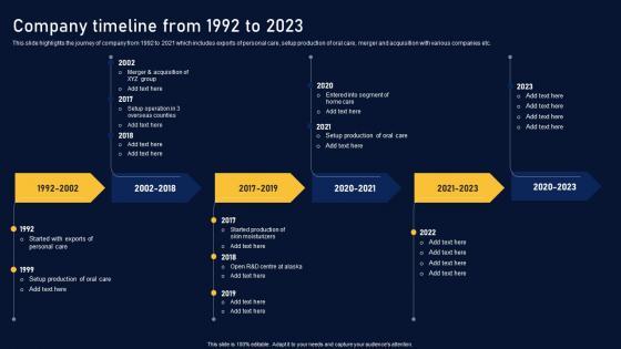 This slide highlights the journey of company from 1992 to 2021 which includes exports of personal care, setup production of oral care, merger and acquisition with various companies etc. Are you in need of a template that can accommodate all of your creative concepts This one is crafted professionally and can be altered to fit any style. Use it with Google Slides or PowerPoint. Include striking photographs, symbols, depictions, and other visuals. Fill, move around, or remove text boxes as desired. Test out color palettes and font mixtures. Edit and save your work, or work with colleagues. Download Company Timeline From 1992 To 2023 Multinational Organization Customer Goods Template Pdf and observe how to make your presentation outstanding. Give an impeccable presentation to your group and make your presentation unforgettable. This slide highlights the journey of company from 1992 to 2021 which includes exports of personal care, setup production of oral care, merger and acquisition with various companies etc.