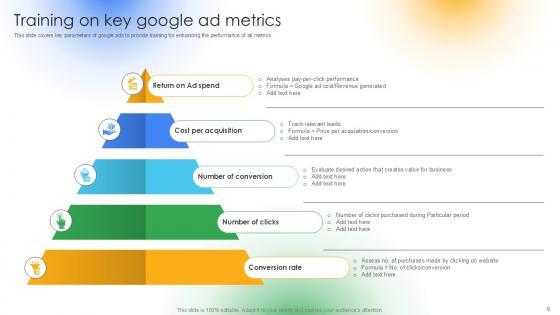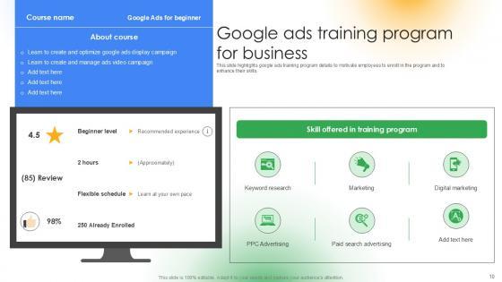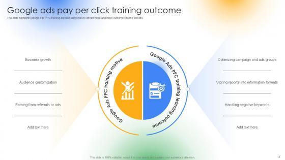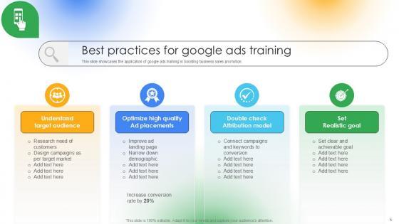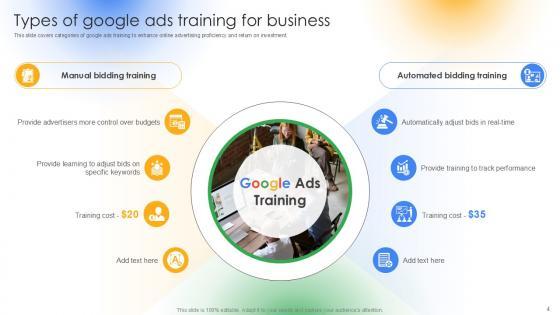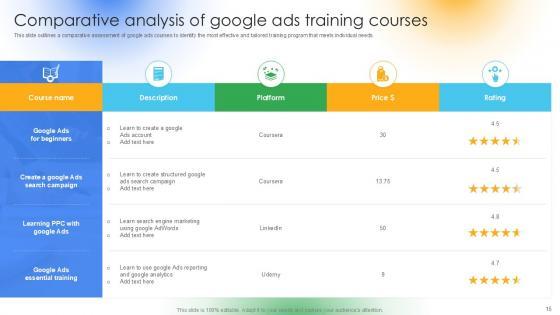 Conduct adequate research on all facets of your business and grow its in sales, profit, etc using this ready-made PPT slide. This GOOGLE Ad Training Powerpoint Ppt Template Bundles displays parameters to help you evaluate business environment from all angles. Incorporate this organized PPT Design in Keyword Research Training, Ad Performance Analysis, Google Ads Certification slides to classify your top challengers. It is a customizable slide, so use it as per your requirement. Download now to showcase your expertise in all things business, and the specialized knowledge you may have. Unlock the potential of Google Ads with our all-inclusive training PowerPoint presentation. Whether you are new to marketing or an experienced pro, our slides cover everything from keyword research to advanced ad performance analysis. Learn PPC advertising strategies, Google campaign techniques, and how to earn your Google Ads certification. With clear visuals and expert insights, this presentation equips you with the skills to maximize your advertising ROI and stay ahead in your marketing strategy.