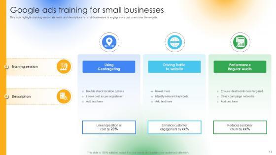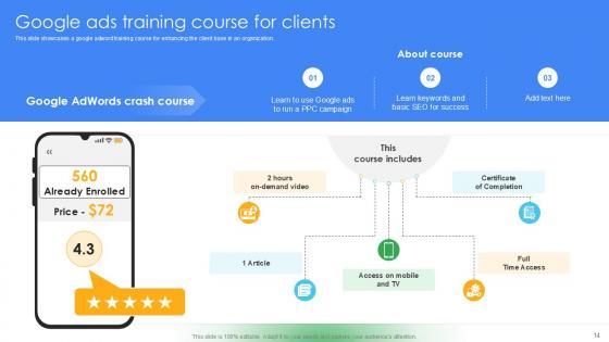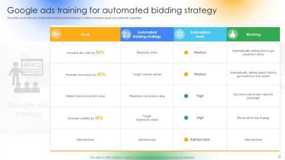 Share a great deal of information on the topic by deploying this google ads ppt powerpoint presentation complete with slides. Support your ideas and thought process with this prefabricated set. It includes a set of twelve slides, all fully modifiable and editable. Each slide can be restructured and induced with the information and content of your choice. You can add or remove large content boxes as well, to make this PPT slideshow more personalized. Its high-quality graphics and visuals help in presenting a well-coordinated pitch. This PPT template is also a resourceful tool to take visual cues from and implement the best ideas to help your business grow and expand. The main attraction of this well-formulated deck is that everything is editable, giving you the freedom to adjust it to your liking and choice. Changes can be made in the background and theme as well to deliver an outstanding pitch. Therefore, click on the download button now to gain full access to this multifunctional set.