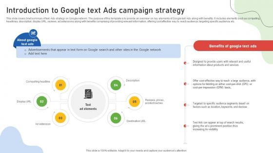 This slide covers brief summary of text Ads strategy on Google network. The purpose of this template is to provide an overview on key elements of Google text Ads along with benefits. It includes elements such as compelling headlines, description, display URL, reviews, ad extensions along with benefits comprising of providing relevant information, offering cost effective way to reach audience, targeting specific audience, etc. Find highly impressive Google Ads Categories Introduction To Google Text Ads Campaign Strategy MKT SS V on Slidegeeks to deliver a meaningful presentation. You can save an ample amount of time using these presentation templates. No need to worry to prepare everything from scratch because Slidegeeks experts have already done a huge research and work for you. You need to download Google Ads Categories Introduction To Google Text Ads Campaign Strategy MKT SS V for your upcoming presentation. All the presentation templates are 100 percent editable and you can change the color and personalize the content accordingly. Download now This slide covers brief summary of text Ads strategy on Google network. The purpose of this template is to provide an overview on key elements of Google text Ads along with benefits. It includes elements such as compelling headlines, description, display URL, reviews, ad extensions along with benefits comprising of providing relevant information, offering cost effective way to reach audience, targeting specific audience, etc.