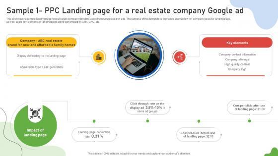 This slide covers sample landing page for real estate company directing users from Google search ads. The purpose of this template is to provide an overview on company goals for landing page, ad type used, key elements of landing page along with impact on CTR, CPC, etc. Make sure to capture your audiences attention in your business displays with our gratis customizable Google Ads Categories Sample 1 PPC Landing Page For A Real Estate Company MKT SS V. These are great for business strategies, office conferences, capital raising or task suggestions. If you desire to acquire more customers for your tech business and ensure they stay satisfied, create your own sales presentation with these plain slides. This slide covers sample landing page for real estate company directing users from Google search ads. The purpose of this template is to provide an overview on company goals for landing page, ad type used, key elements of landing page along with impact on CTR, CPC, etc.