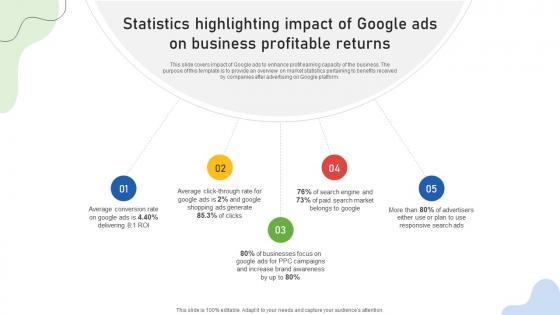 This slide covers impact of Google ads to enhance profit earning capacity of the business. The purpose of this template is to provide an overview on market statistics pertaining to benefits received by companies after advertising on Google platform. Coming up with a presentation necessitates that the majority of the effort goes into the content and the message you intend to convey. The visuals of a PowerPoint presentation can only be effective if it supplements and supports the story that is being told. Keeping this in mind our experts created Google Ads Categories Statistics Highlighting Impact Of Google Ads On Business MKT SS V to reduce the time that goes into designing the presentation. This way, you can concentrate on the message while our designers take care of providing you with the right template for the situation. This slide covers impact of Google ads to enhance profit earning capacity of the business. The purpose of this template is to provide an overview on market statistics pertaining to benefits received by companies after advertising on Google platform.