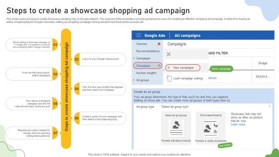 This slide covers process to create showcase shopping Ads on Google network. The purpose of this template is provide guidelines to users for creating an effective shopping ad campaign. It starts from having an active shopping feed in Google merchant, setting up shopping campaign, linking relevant merchant centre account, etc. This Google Ads Categories Steps To Create A Showcase Shopping Ad Campaign MKT SS V is perfect for any presentation, be it in front of clients or colleagues. It is a versatile and stylish solution for organizing your meetings. The Google Ads Categories Steps To Create A Showcase Shopping Ad Campaign MKT SS V features a modern design for your presentation meetings. The adjustable and customizable slides provide unlimited possibilities for acing up your presentation. Slidegeeks has done all the homework before launching the product for you. So, do not wait, grab the presentation templates today This slide covers process to create showcase shopping Ads on Google network. The purpose of this template is provide guidelines to users for creating an effective shopping ad campaign. It starts from having an active shopping feed in Google merchant, setting up shopping campaign, linking relevant merchant centre account, etc.