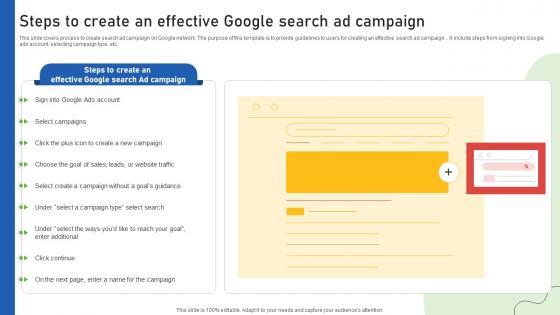 This slide covers process to create search ad campaign on Google network. The purpose of this template is to provide guidelines to users for creating an effective search ad campaign. . It include steps from signing into Google ads account, selecting campaign type, etc. Welcome to our selection of the Google Ads Categories Steps To Create An Effective Google Search Ad Campaign MKT SS V. These are designed to help you showcase your creativity and bring your sphere to life. Planning and Innovation are essential for any business that is just starting out. This collection contains the designs that you need for your everyday presentations. All of our PowerPoints are 100Percent editable, so you can customize them to suit your needs. This multi-purpose template can be used in various situations. Grab these presentation templates today. This slide covers process to create search ad campaign on Google network. The purpose of this template is to provide guidelines to users for creating an effective search ad campaign. . It include steps from signing into Google ads account, selecting campaign type, etc.