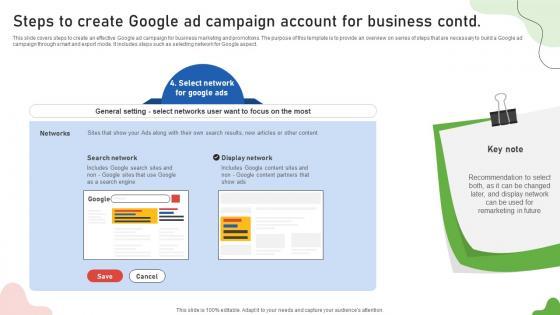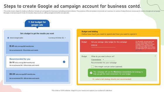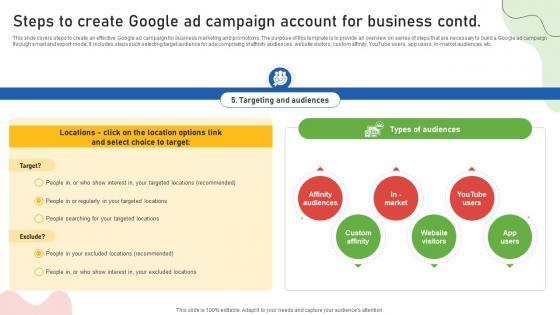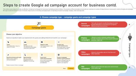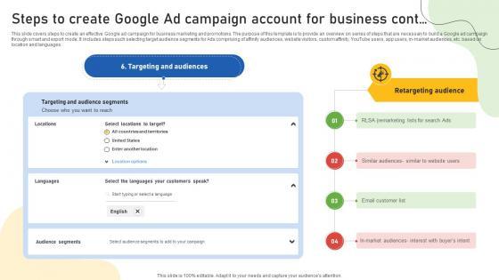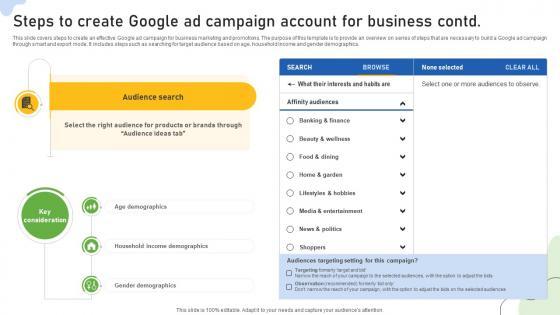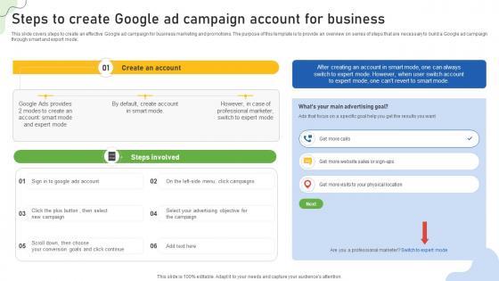 This slide covers steps to create an effective Google ad campaign for business marketing and promotions. The purpose of this template is to provide an overview on series of steps that are necessary to build a Google ad campaign through smart and export mode. Explore a selection of the finest Google Ads Categories Steps To Create Google Ad Campaign Account For Business MKT SS V here. With a plethora of professionally designed and pre-made slide templates, you can quickly and easily find the right one for your upcoming presentation. You can use our Google Ads Categories Steps To Create Google Ad Campaign Account For Business MKT SS V to effectively convey your message to a wider audience. Slidegeeks has done a lot of research before preparing these presentation templates. The content can be personalized and the slides are highly editable. Grab templates today from Slidegeeks. This slide covers steps to create an effective Google ad campaign for business marketing and promotions. The purpose of this template is to provide an overview on series of steps that are necessary to build a Google ad campaign through smart and export mode.