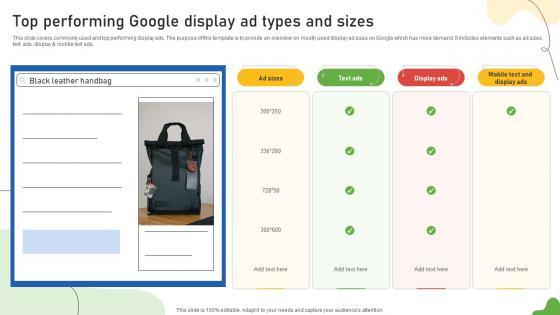 This slide covers commonly used and top performing display ads. The purpose of this template is to provide an overview on mostly used display ad sizes on Google which has more demand. It includes elements such as ad sizes, text ads, display and mobile text ads. Presenting this PowerPoint presentation, titled Google Ads Categories Top Performing Google Display Ad Types And Sizes MKT SS V, with topics curated by our researchers after extensive research. This editable presentation is available for immediate download and provides attractive features when used. Download now and captivate your audience. Presenting this Google Ads Categories Top Performing Google Display Ad Types And Sizes MKT SS V. Our researchers have carefully researched and created these slides with all aspects taken into consideration. This is a completely customizable Google Ads Categories Top Performing Google Display Ad Types And Sizes MKT SS V that is available for immediate downloading. Download now and make an impact on your audience. Highlight the attractive features available with our PPTs. This slide covers commonly used and top performing display ads. The purpose of this template is to provide an overview on mostly used display ad sizes on Google which has more demand. It includes elements such as ad sizes, text ads, display and mobile text ads.