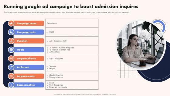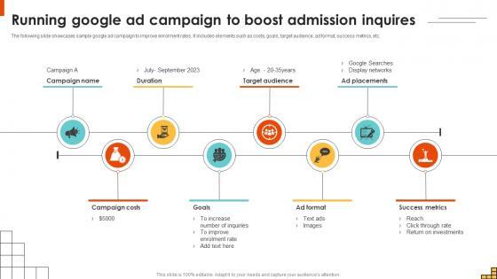 The following slide showcases sample google ad campaign to improve enrolment rates. It includes elements such as costs, goals, target audience, ad format, success metrics, etc. This Running Google Ad Campaign To Boost Admission Inquires Running Marketing Campaigns Strategy SS V from Slidegeeks makes it easy to present information on your topic with precision. It provides customization options, so you can make changes to the colors, design, graphics, or any other component to create a unique layout. It is also available for immediate download, so you can begin using it right away. Slidegeeks has done good research to ensure that you have everything you need to make your presentation stand out. Make a name out there for a brilliant performance. The following slide showcases sample google ad campaign to improve enrolment rates. It includes elements such as costs, goals, target audience, ad format, success metrics, etc.