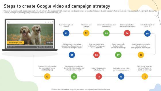This slide covers brief summary of video ad on Google search and display network. The purpose of this template is to provide an overview on introduction of Google video ads, design elements along with benefits. It includes benefits such as helping to reach wide audience, providing highly engaging format to tell a story, providing reports and analytics on performance of ads, etc. If your project calls for a presentation, then Slidegeeks is your go-to partner because we have professionally designed, easy-to-edit templates that are perfect for any presentation. After downloading, you can easily edit Google Ads Categories Introduction To Google Video Ads Campaign Strategy MKT SS V and make the changes accordingly. You can rearrange slides or fill them with different images. Check out all the handy templates This slide covers brief summary of video ad on Google search and display network. The purpose of this template is to provide an overview on introduction of Google video ads, design elements along with benefits. It includes benefits such as helping to reach wide audience, providing highly engaging format to tell a story, providing reports and analytics on performance of ads, etc.