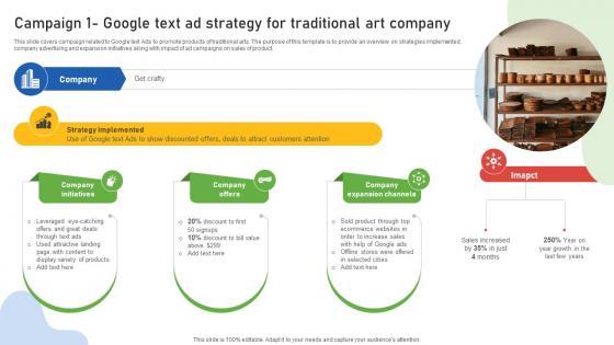 This slide covers campaign related to Google text Ads to promote products of traditional arts. The purpose of this template is to provide an overview on strategies implemented, company advertising and expansion initiatives along with impact of ad campaigns on sales of product. If you are looking for a format to display your unique thoughts, then the professionally designed Google Ads Categories Campaign 1 Google Text Ad Strategy For Traditional Art Company MKT SS V is the one for you. You can use it as a Google Slides template or a PowerPoint template. Incorporate impressive visuals, symbols, images, and other charts. Modify or reorganize the text boxes as you desire. Experiment with shade schemes and font pairings. Alter, share or cooperate with other people on your work. Download Google Ads Categories Campaign 1 Google Text Ad Strategy For Traditional Art Company MKT SS V and find out how to give a successful presentation. Present a perfect display to your team and make your presentation unforgettable. This slide covers campaign related to Google text Ads to promote products of traditional arts. The purpose of this template is to provide an overview on strategies implemented, company advertising and expansion initiatives along with impact of ad campaigns on sales of product.