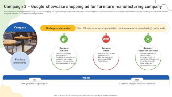 This slide covers campaign related to Google showcase shopping ads to generate high quality leads. The purpose of this template is to provide an overview on strategies implemented, company advertising and expansion initiatives along with impact of ad campaigns on lead generation. Crafting an eye-catching presentation has never been more straightforward. Let your presentation shine with this tasteful yet straightforward Google Ads Categories Campaign 3 Google Showcase Shopping Ad For Furniture Manufacturing MKT SS V template. It offers a minimalistic and classy look that is great for making a statement. The colors have been employed intelligently to add a bit of playfulness while still remaining professional. Construct the ideal Google Ads Categories Campaign 3 Google Showcase Shopping Ad For Furniture Manufacturing MKT SS V that effortlessly grabs the attention of your audience Begin now and be certain to wow your customers This slide covers campaign related to Google showcase shopping ads to generate high quality leads. The purpose of this template is to provide an overview on strategies implemented, company advertising and expansion initiatives along with impact of ad campaigns on lead generation.