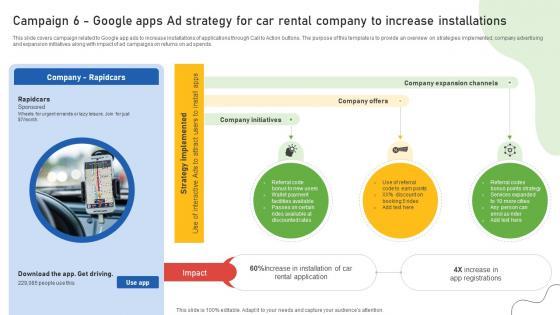 This slide covers campaign related to Google app ads to increase installations of applications through Call to Action buttons. The purpose of this template is to provide an overview on strategies implemented, company advertising and expansion initiatives along with impact of ad campaigns on returns on ad spends. Coming up with a presentation necessitates that the majority of the effort goes into the content and the message you intend to convey. The visuals of a PowerPoint presentation can only be effective if it supplements and supports the story that is being told. Keeping this in mind our experts created Google Ads Categories Campaign 6 Google Apps Ad Strategy For Car Rental Company To Increase MKT SS V to reduce the time that goes into designing the presentation. This way, you can concentrate on the message while our designers take care of providing you with the right template for the situation. This slide covers campaign related to Google app ads to increase installations of applications through Call to Action buttons. The purpose of this template is to provide an overview on strategies implemented, company advertising and expansion initiatives along with impact of ad campaigns on returns on ad spends.
