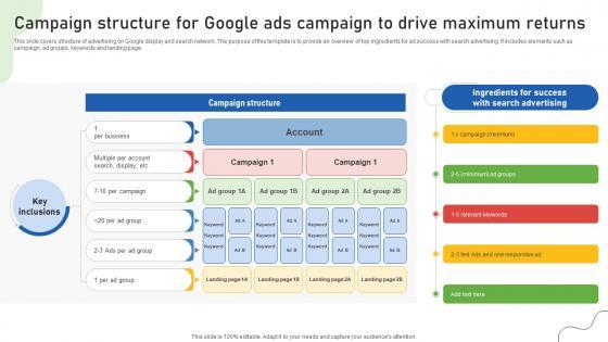 This slide covers structure of advertising on Google display and search network. The purpose of this template is to provide an overview of top ingredients for ad success with search advertising. It includes elements such as campaign, ad groups, keywords and landing page. This modern and well-arranged Google Ads Categories Campaign Structure For Google Ads Campaign To Drive Maximum Returns MKT SS V provides lots of creative possibilities. It is very simple to customize and edit with the Powerpoint Software. Just drag and drop your pictures into the shapes. All facets of this template can be edited with Powerpoint, no extra software is necessary. Add your own material, put your images in the places assigned for them, adjust the colors, and then you can show your slides to the world, with an animated slide included. This slide covers structure of advertising on Google display and search network. The purpose of this template is to provide an overview of top ingredients for ad success with search advertising. It includes elements such as campaign, ad groups, keywords and landing page.