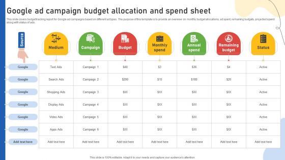 This slide covers budget tracking report for Google ad campaigns based on different ad types. The purpose of this template is to provide an overview on monthly budget allocations, ad spent, remaining budgets, projected spend along with status of ads. Retrieve professionally designed Google Ads Categories Google Ad Campaign Budget Allocation And Spend Sheet MKT SS V to effectively convey your message and captivate your listeners. Save time by selecting pre-made slideshows that are appropriate for various topics, from business to educational purposes. These themes come in many different styles, from creative to corporate, and all of them are easily adjustable and can be edited quickly. Access them as PowerPoint templates or as Google Slides themes. You do not have to go on a hunt for the perfect presentation because Slidegeeks got you covered from everywhere. This slide covers budget tracking report for Google ad campaigns based on different ad types. The purpose of this template is to provide an overview on monthly budget allocations, ad spent, remaining budgets, projected spend along with status of ads.