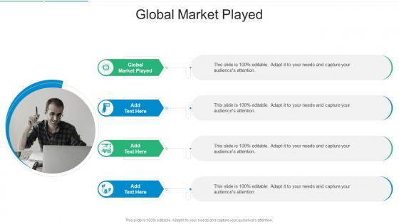 Introducing our well-designed Global Market Played In Powerpoint And Google Slides Cpb. This PowerPoint design presents information on topics like Global Market Played. As it is predesigned it helps boost your confidence level. It also makes you a better presenter because of its high-quality content and graphics. This PPT layout can be downloaded and used in different formats like PDF, PNG, and JPG. Not only this, it is available in both Standard Screen and Widescreen aspect ratios for your convenience. Therefore, click on the download button now to persuade and impress your audience. Our Global Market Played In Powerpoint And Google Slides Cpb are topically designed to provide an attractive backdrop to any subject. Use them to look like a presentation pro.