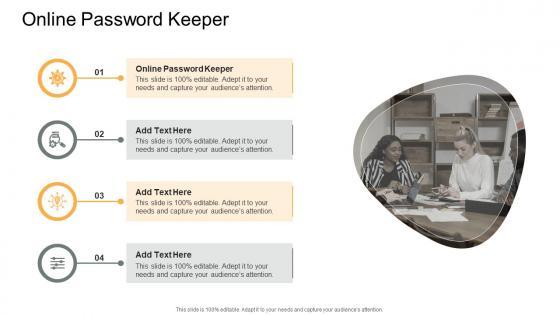 Presenting our innovatively designed set of slides titled Online Password Keeper In Powerpoint And Google Slides Cpb. This completely editable PowerPoint graphic exhibits Online Password Keeper that will help you convey the message impactfully. It can be accessed with Google Slides and is available in both standard screen and widescreen aspect ratios. Apart from this, you can download this well structured PowerPoint template design in different formats like PDF, JPG, and PNG. So, click the download button now to gain full access to this PPT design. Our Online Password Keeper In Powerpoint And Google Slides Cpb are topically designed to provide an attractive backdrop to any subject. Use them to look like a presentation pro.